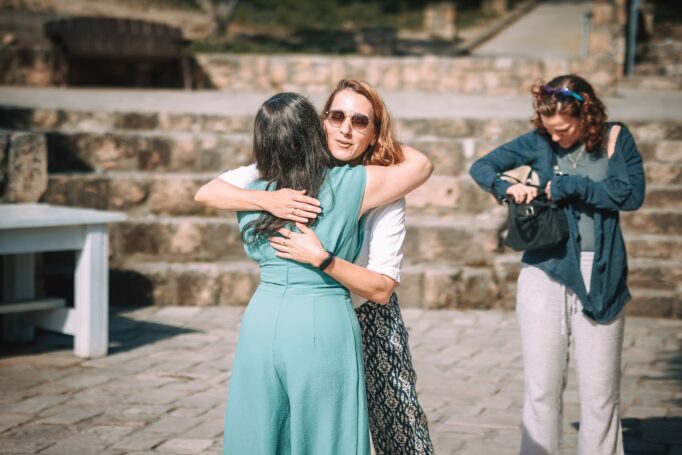 הנשים מגיעות ראשונות, מחויכות ומלאות באנרגיה חיובית. אחת מהן אפילו מצליחה להסתיר את הכרטיס ברכה בג'ינס שלה, כאילו הוא היה הסוד הכי גדול של היום. עוד כמה רגעים ואנחנו רואים חיבוקים חמים בין אמא לבין אורחות נוספות, שהן כמובן חלק מהמשפחה המורחבת