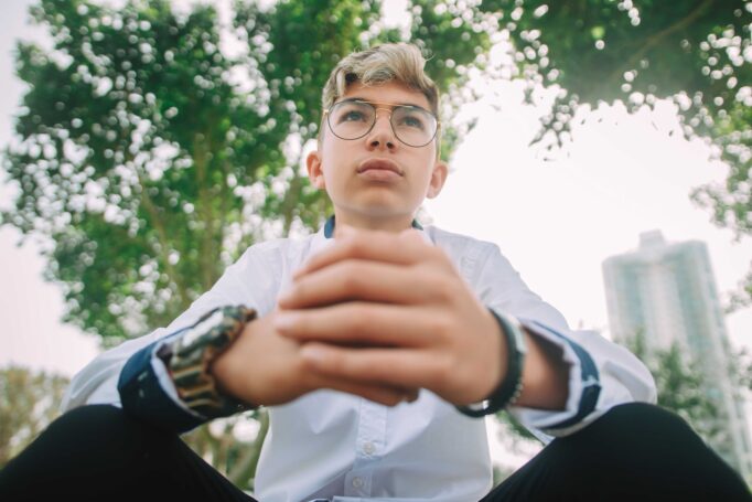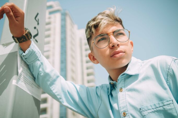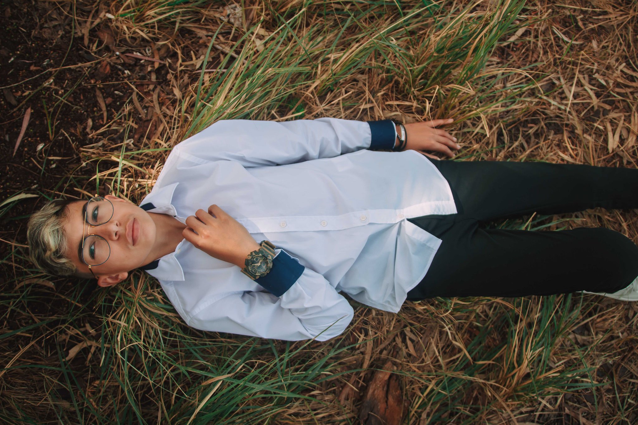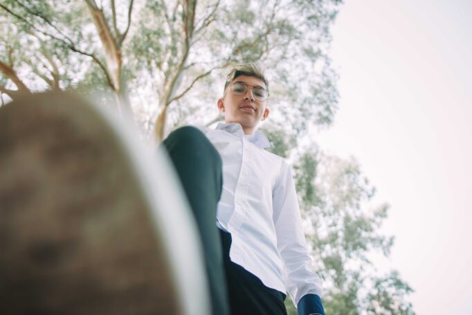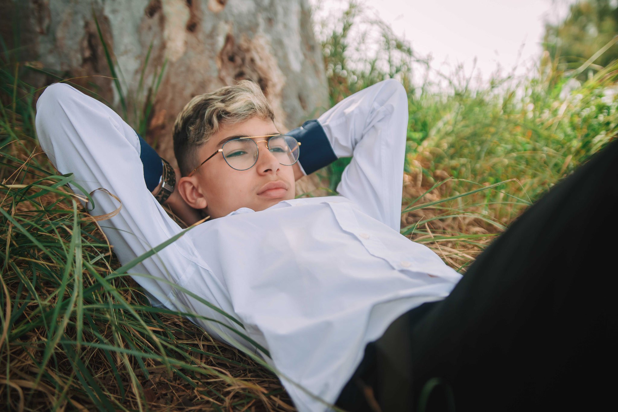 הנער שוכב על השרכים ואני מצלם ממבט של ציפור- צילום תקריב מלמעלה, תופס את מבט עיניו מבעד למשקפיים, תופס את החיבור בין הטבע והגוף