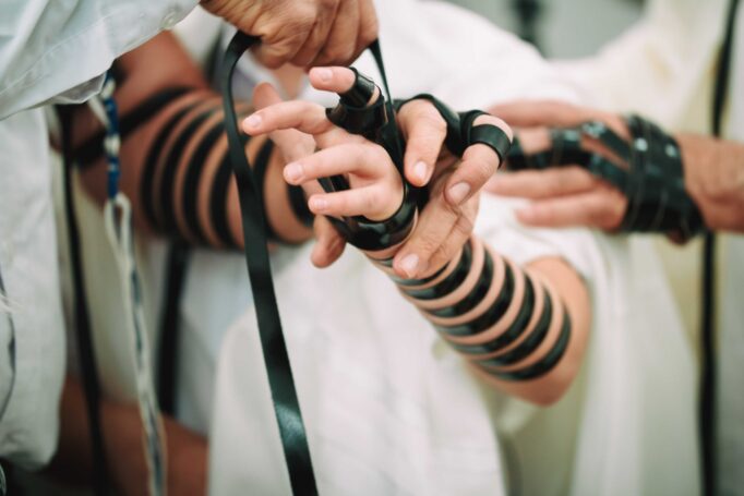 זמן של הקדשות, ברכות ואיחולים ומועבר לחתן בר המצווה טלית חדשה, הנער מתעטף בטליתו. אני תופס את הזמן המיוחד הזה. צילום מקרוב התופס את הטלית כרוכה מסביב לפנים בעודו מתעטף. זה זמן מרגש בו הנער לוקח את עול המצוות עליו