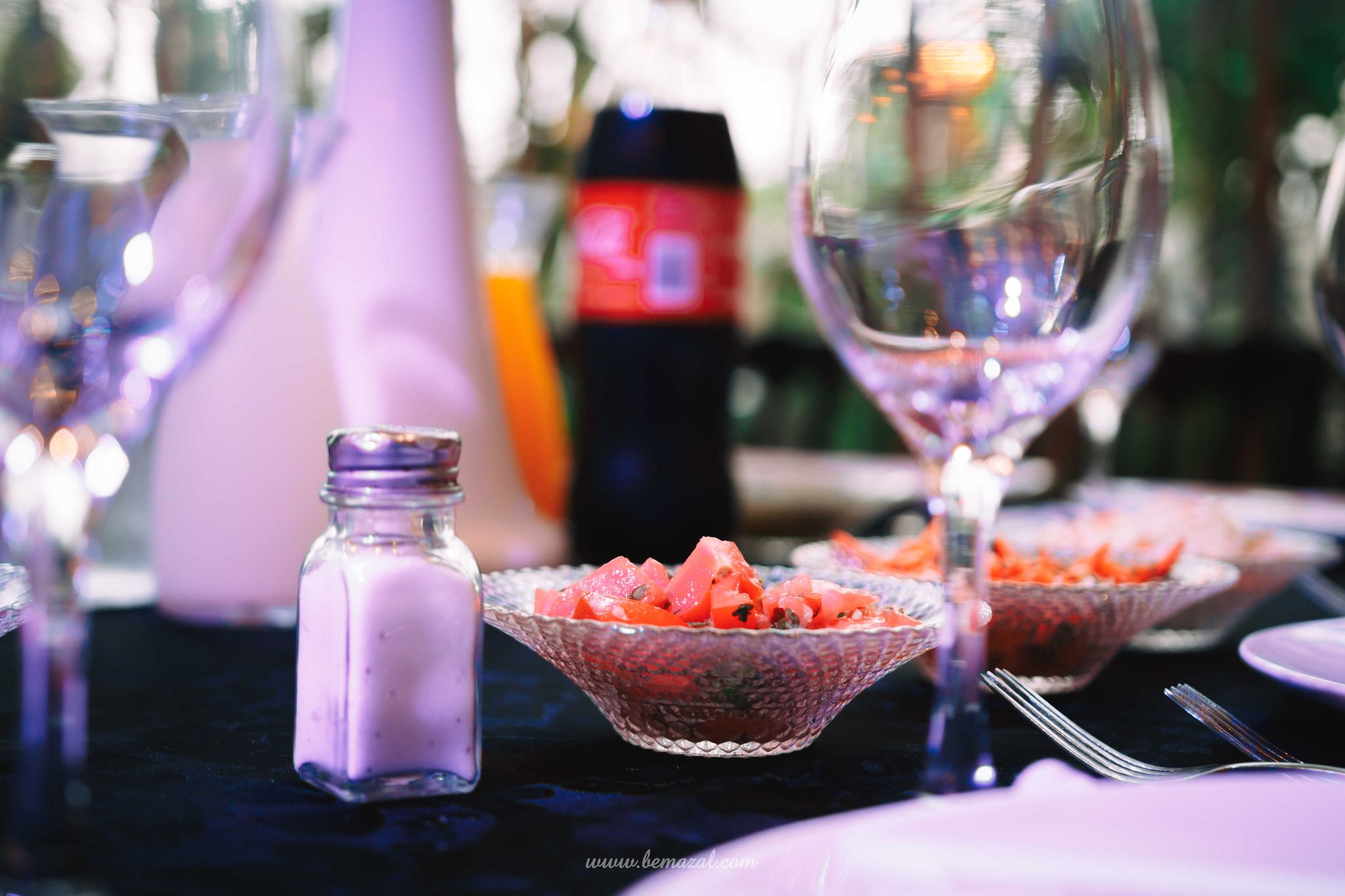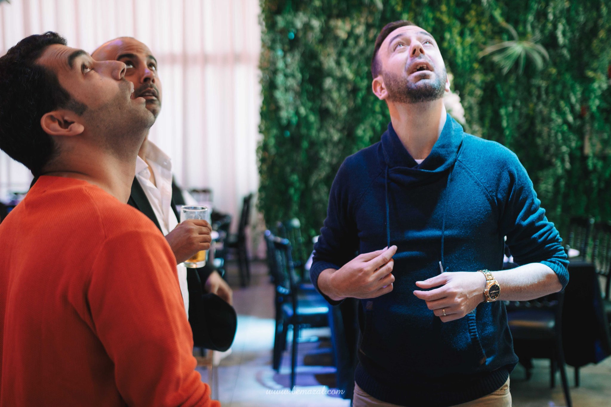 אני מצלם תמונות ראשונות של האולם ומתפלא משילוב הצמחייה בקיר האולם עם התפאורה מסביב כמו הנורות עמוד הפרחים בכל שולחן ומעמד לד גבוה שמוביל לתקרה שנראה כמו פוסטר בצבע אש