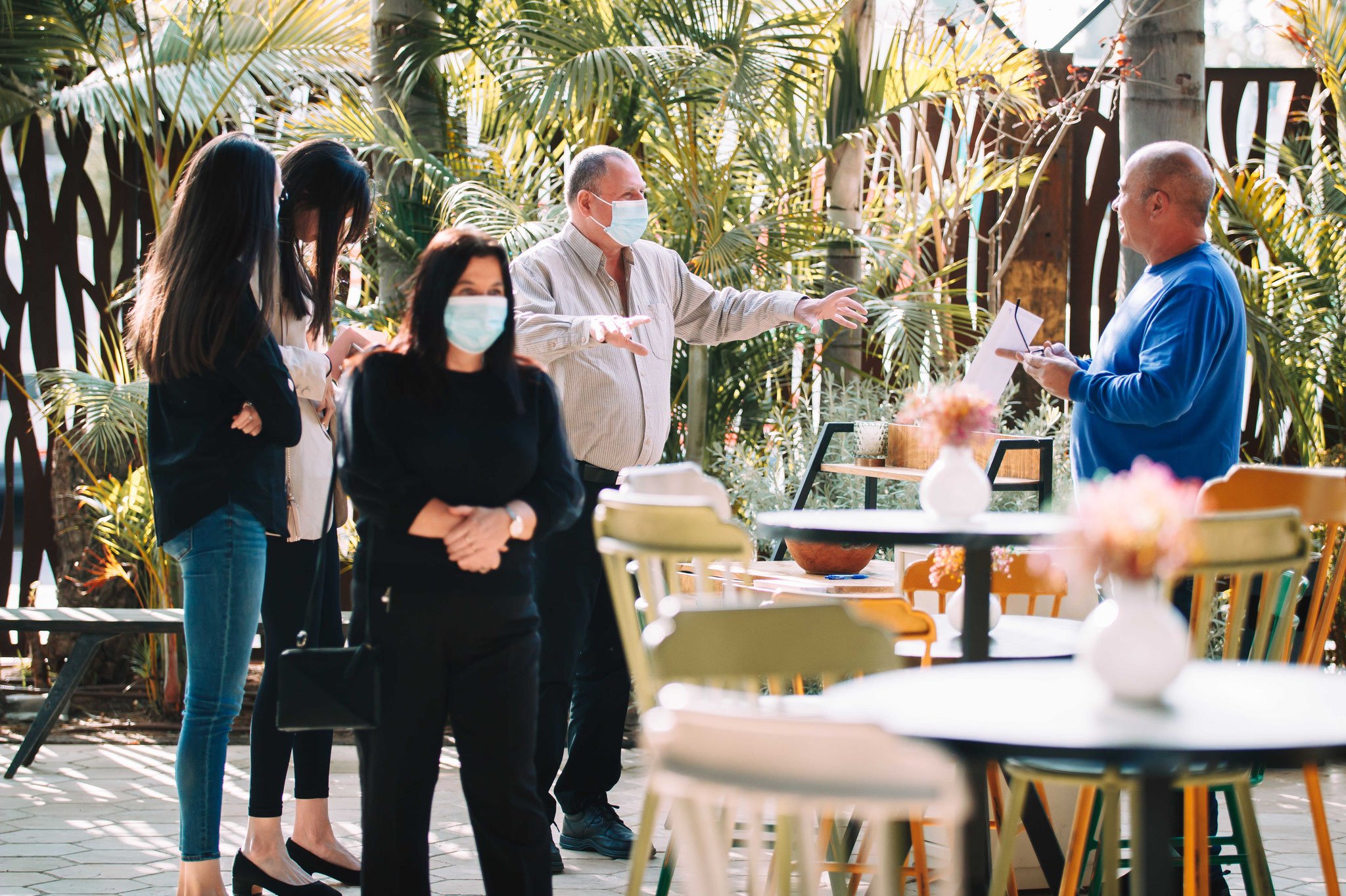 האווירה היא של בייחד, התרגשות מסוג אחר- המשפחה והאורחים לא ראו זה את זה זמן רב בשל הקורונה והסגרים שהיו. האורחים, המשפחה, מתוודעים מחדש זה לזה מחדש, מחליפים רשמים וחוויות, מתעניינים בשלומו של האחר. עם המסכות ככה מתחת לסנטר וחלקם עם מסיכות על הפנים, מתחבקים הם. הילדים מתכנסים במעגל ומתחבקים אחד עם השני, וכל זה במקום המהמם הזה, עם הבלונים והצמחייה המהממת שברקע. שימו לב לשער הבלונים המהמם, איך אפשר שלא להתרשם ממנו?, בכדי להמחיש את עוצמתו באתי בהיפוך ואחר כך ישר בצילום כאילו אני נכנס ועובר דרך השער, וזה בצמוד לאורחים הממשיכים להתוודע זה לזה וחלק עוד ממשיך להגיע