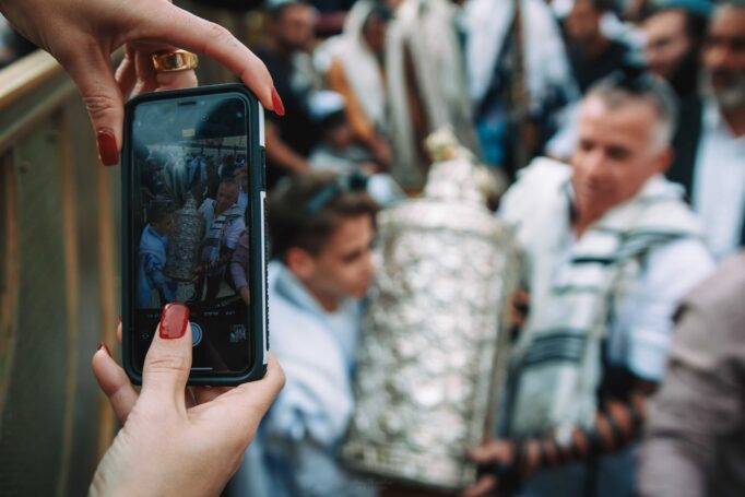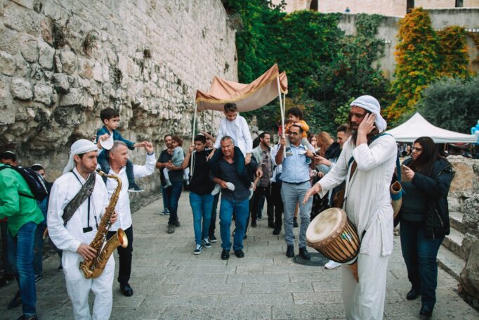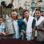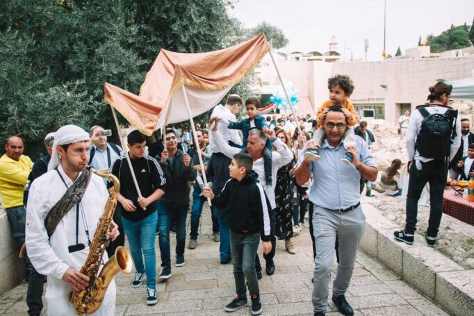 האירוע התחיל כמובן מהפגישה הראשונית של המשפחה עם המוזמנים ברחבת הכותל, מעין קבלת פנים מרגשת אך רגילה לחלוטין שנתפסת כטבעית גם בתמונות. האורחים הונחו לגשת אל בופה שכלל גבינות ומטבלים, בורקסים ממולאים בתפוחי אדמה או גבינות, סנדוויצים קטנים ואישיים, וכמובן שתייה. אחרי ארוחת הבוקר אפשר היה להתקדם ישר לתהלוכת המתופפים המושקעת שכללה זוג נגנים שגם תקעו בשופר, היו לבושים בלבן חגיגי כשאחד מהם מנן על סקסופון והשני על תופים, הנער עמד עם הוריו מתחת ליריעת בד כתומה מהודרת כמעין חופה, ואותם ליוו בשיירה המשפחה והחברים אל הכותל, כשכולם גם לא שוכחים לצהול בשמחה ולרקוד לאור המאורע המרגש, מעין הפוגה בדרך לקריאה בתורה עבור הנער