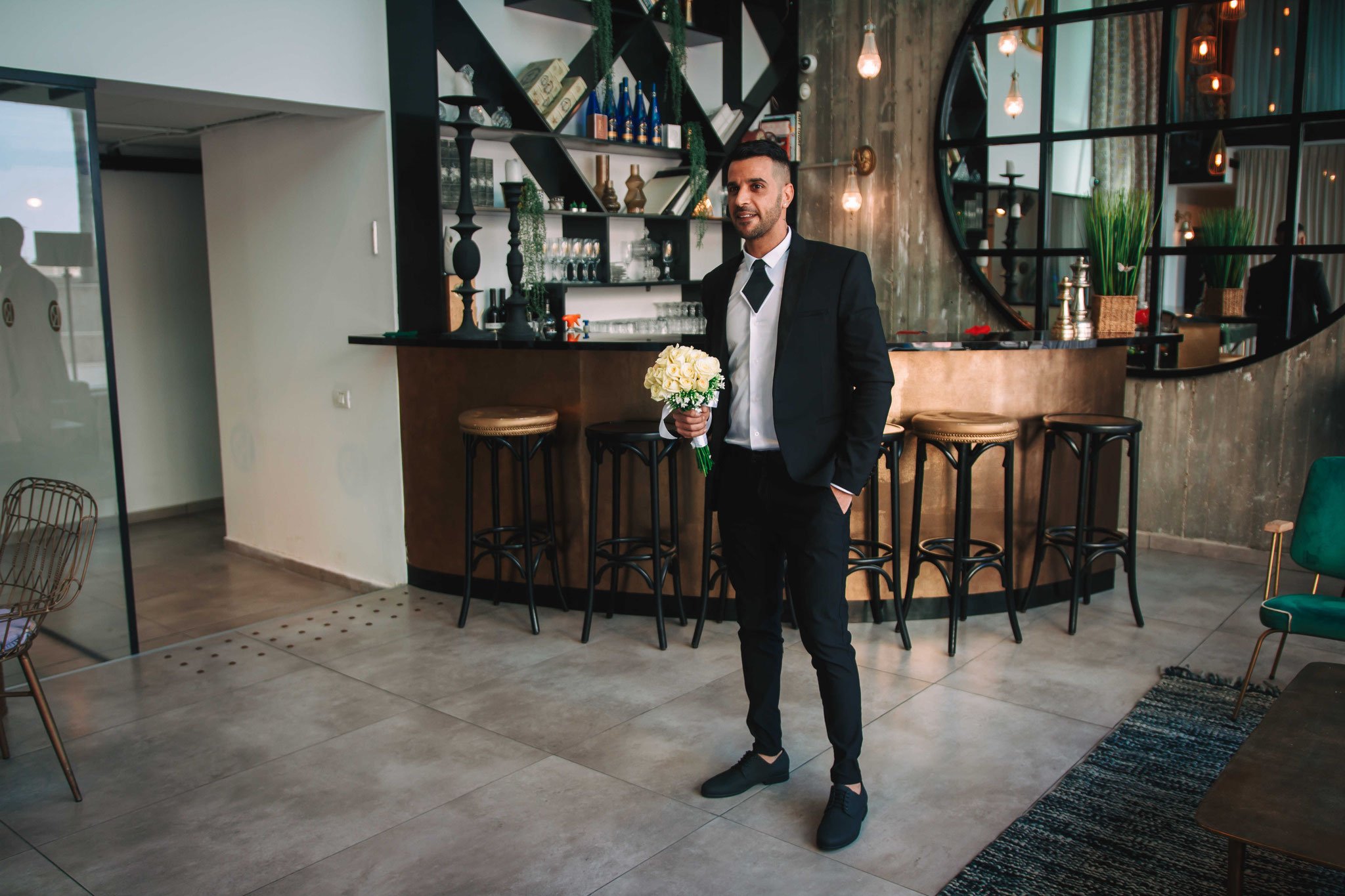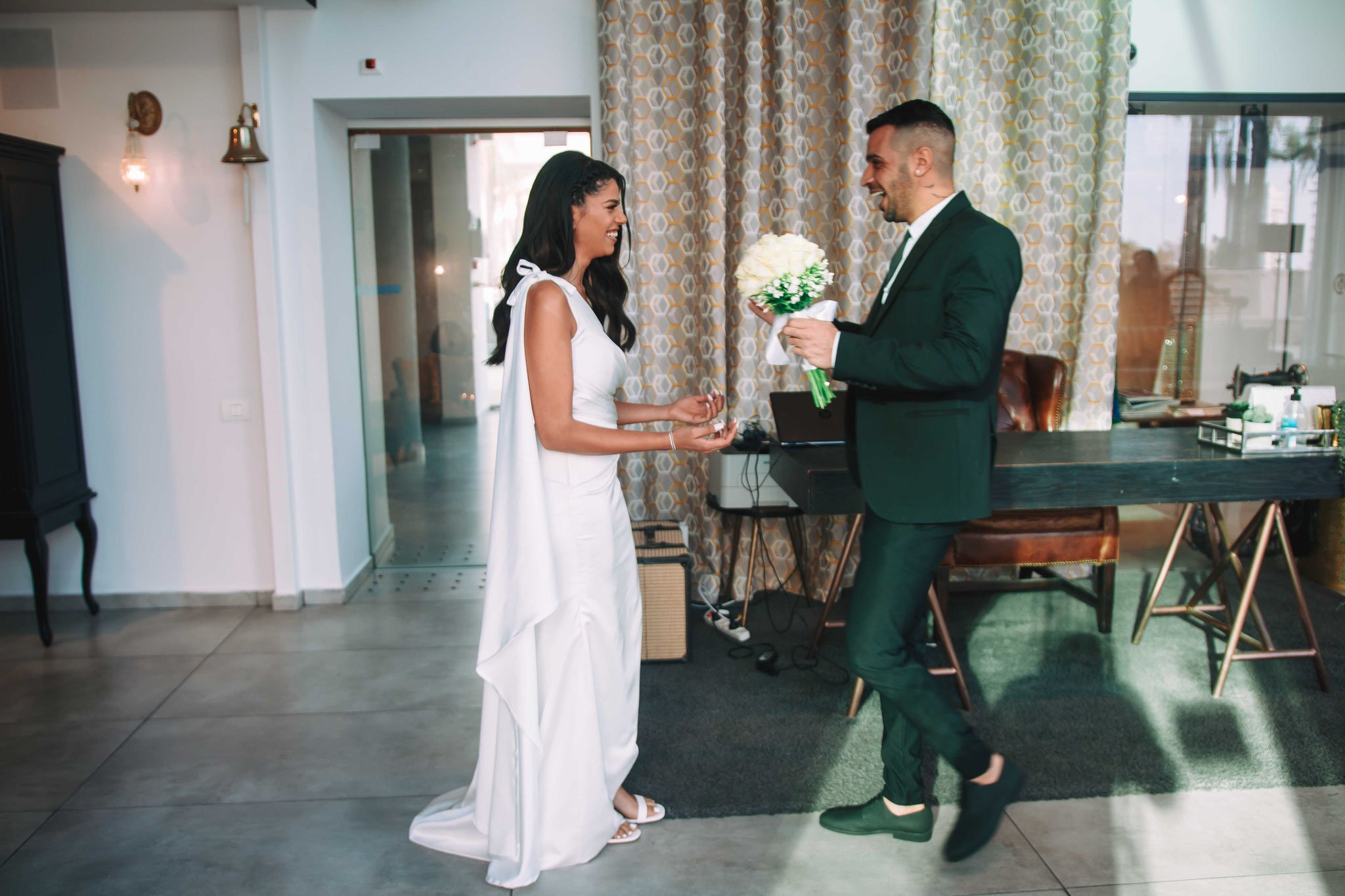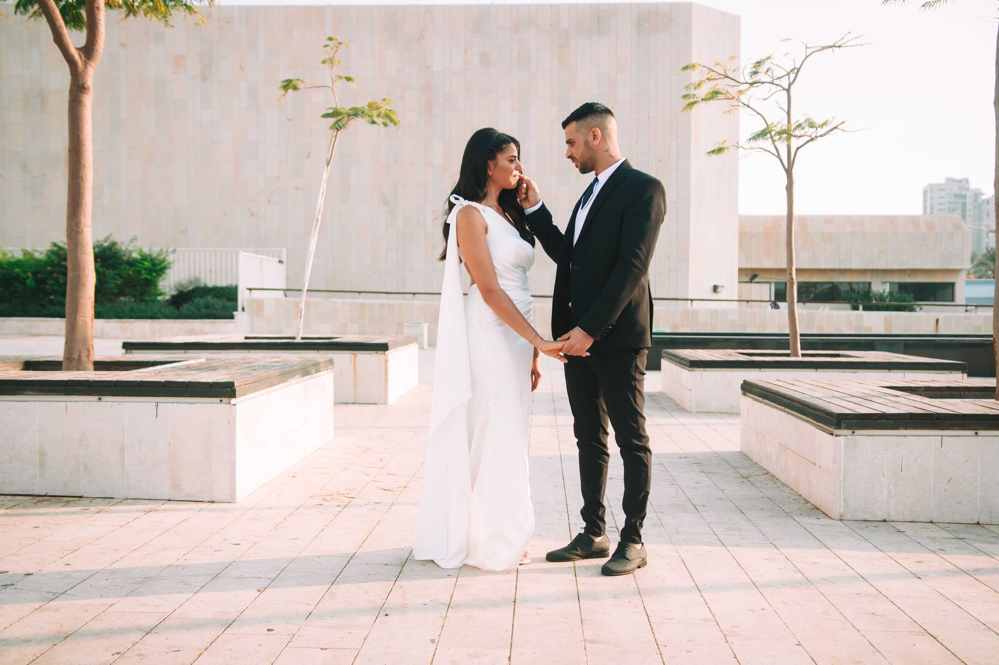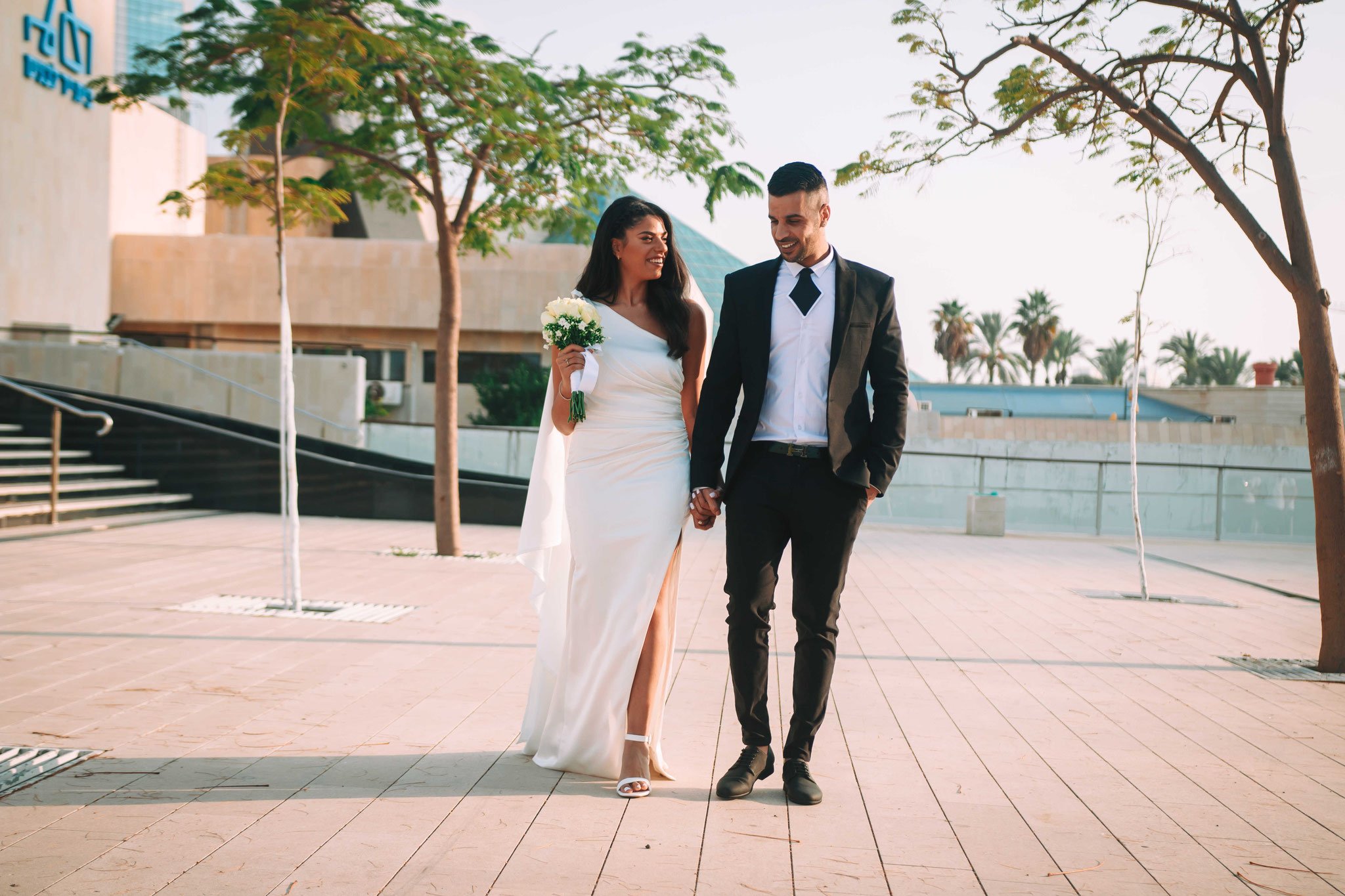 לאחר מכן הגענו לסלון כלות באשדוד בו חיכתה שמלת הכלה, וגם החתן לצילומים משותפים על יד הבר במקום. אפשר היה לראות את החתן נרגש לראות את הכלה לראשונה בשמלתה, החתן חיכה לה והם זכו לרגע מיוחד משלהם בהם יכלו להתחבק ולהתרגש יחדיו. החתן החזק בידיו זר פרחים כנהוג בחתונות והעביר את הזר לידיה של הכלה הנרגשת. הצילומים המשיכו לצילומי חוץ באשדוד במרכז אומנויות בו כלל המבנים נראים מעוצבים אדריכלית והיה ברור לי שהצילומים במקום יצאו מיוחדים. במרכז הזוג המאושר זכה להתהלך יחד , להתנשק ולרקוד מעט, במקביל גם להצטלם עם החברים המלווים בחתונה, וזכו בתמונות שנראות אורבניות ביחס למבנים במקום