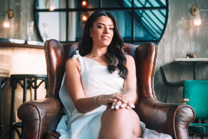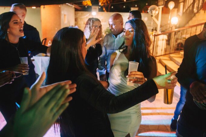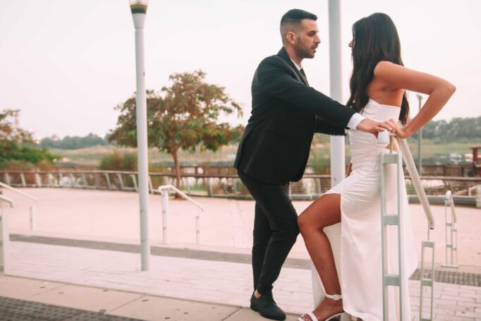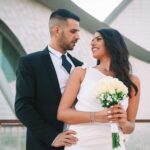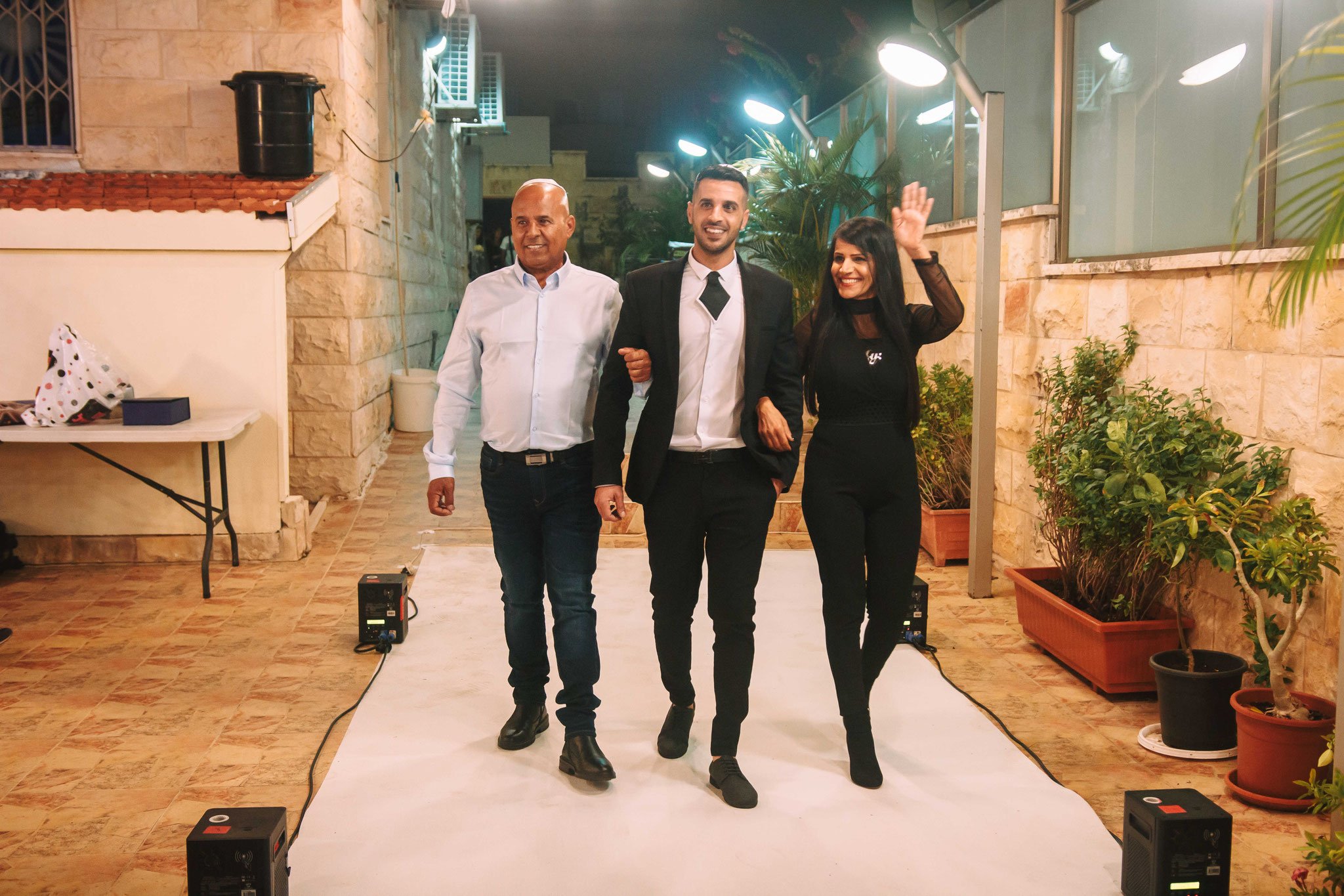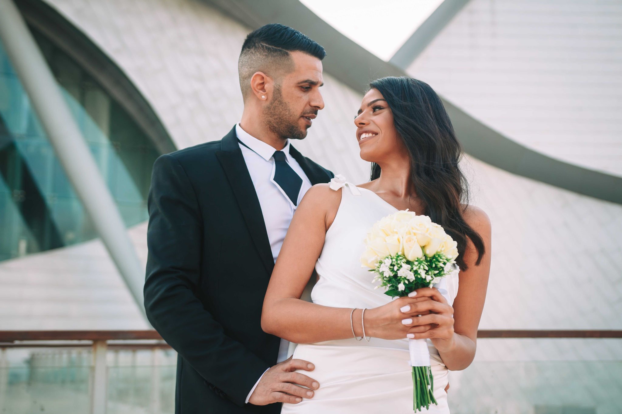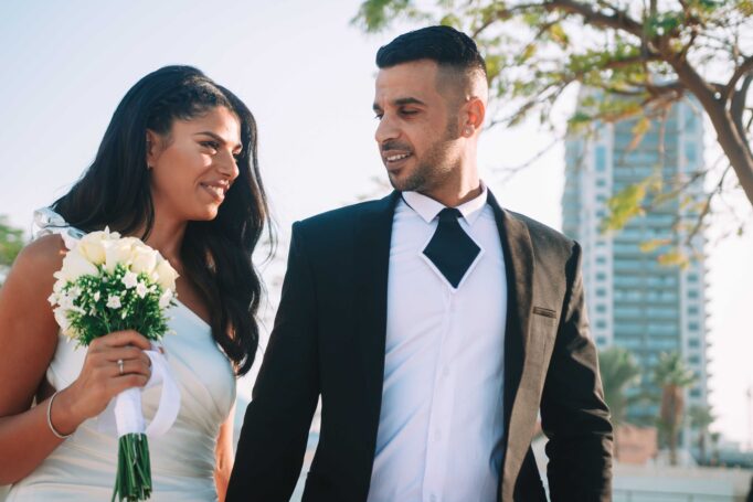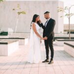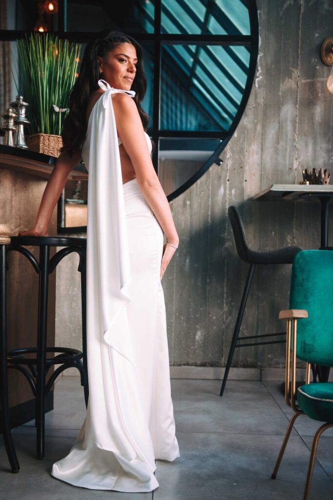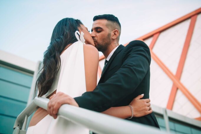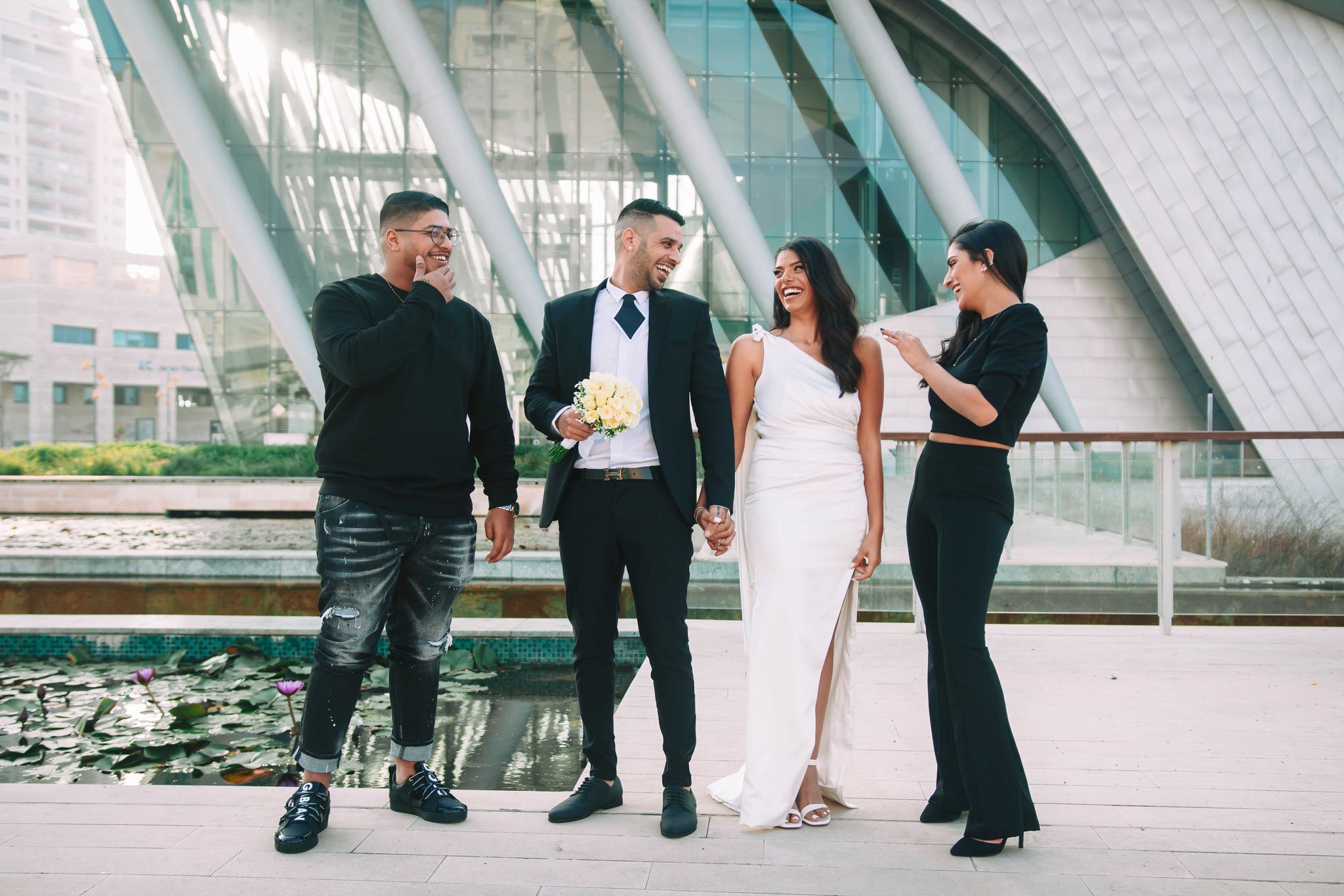 לאחר מכן הגענו לסלון כלות באשדוד בו חיכתה שמלת הכלה, וגם החתן לצילומים משותפים על יד הבר במקום. אפשר היה לראות את החתן נרגש לראות את הכלה לראשונה בשמלתה, החתן חיכה לה והם זכו לרגע מיוחד משלהם בהם יכלו להתחבק ולהתרגש יחדיו. החתן החזק בידיו זר פרחים כנהוג בחתונות והעביר את הזר לידיה של הכלה הנרגשת. הצילומים המשיכו לצילומי חוץ באשדוד במרכז אומנויות בו כלל המבנים נראים מעוצבים אדריכלית והיה ברור לי שהצילומים במקום יצאו מיוחדים. במרכז הזוג המאושר זכה להתהלך יחד , להתנשק ולרקוד מעט, במקביל גם להצטלם עם החברים המלווים בחתונה, וזכו בתמונות שנראות אורבניות ביחס למבנים במקום