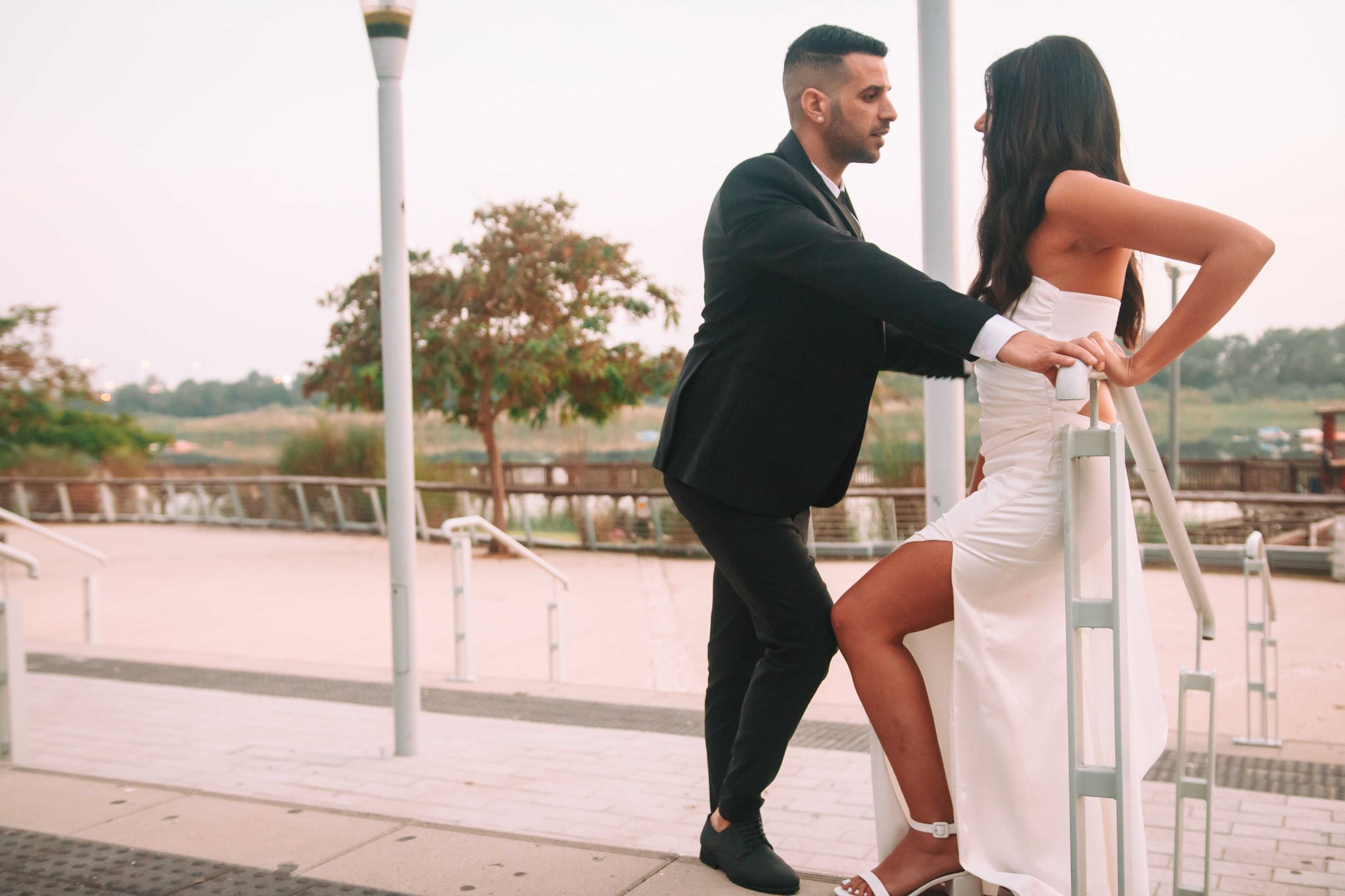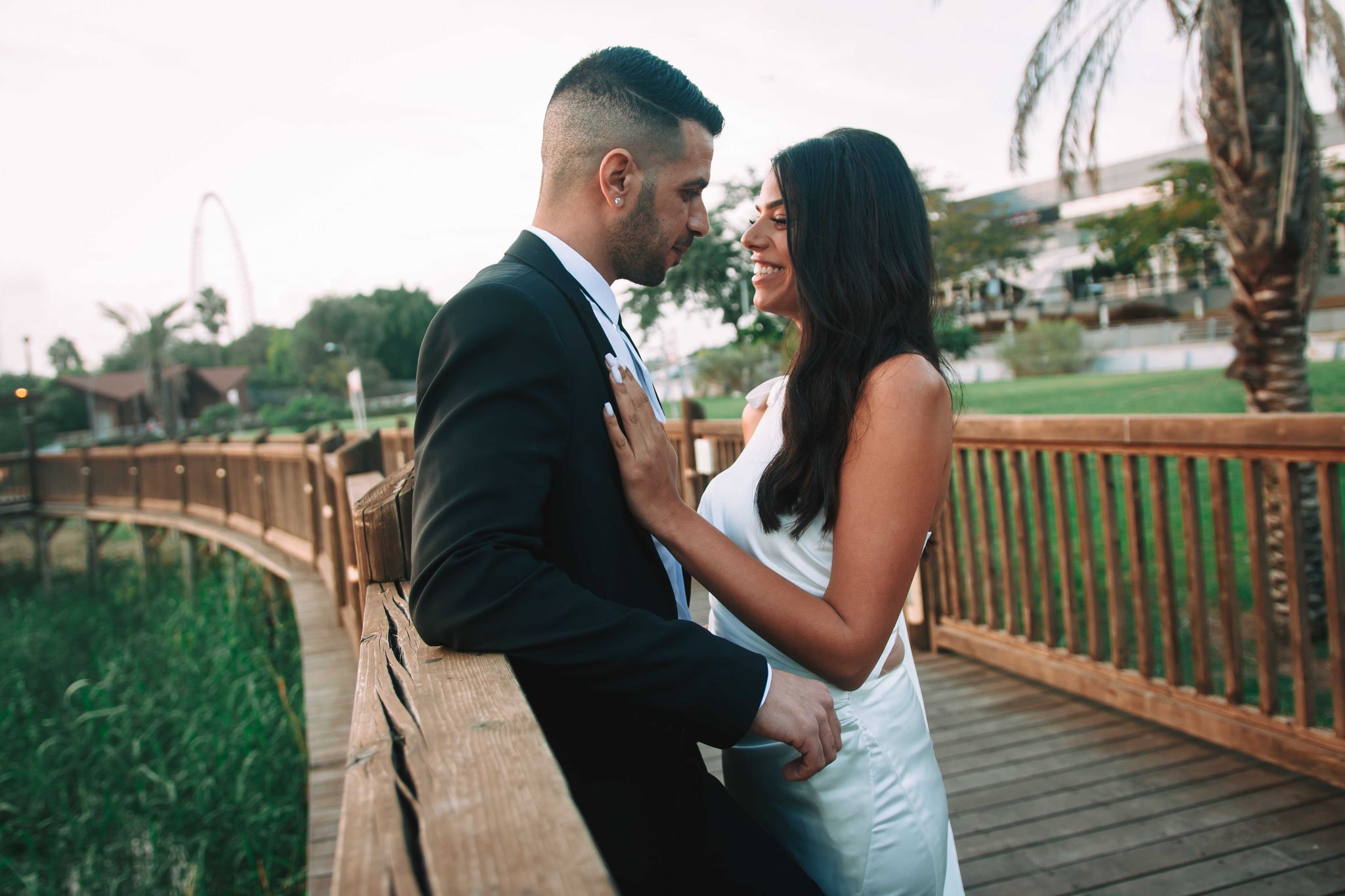 משם המשכנו לצילומים מרהיבים ביופיים ביס פלנט בראשון לציון בגשר הארוך על יד האגם המפורסם, כשממול החתן והכלה גלגל ענק המשקיף ומציץ בתמונה הישר מהסופרלנד. השמיים שיחקו לטובתנו כאילו גם הם הוזמנו לחתונה ודאגו להתעטף בחגיגיות והשמש תרמה לנו אור שהיה חשוב להצלחת התמונות. הכלה והחתן זכו לתמונות זוגיות לצד האגם והעשב הירוק, הגשר החום החליפה השחורה של החתן והשמלה הלבנה של הכלה, זה נראה ממש כמו ציורים מהאגדות. כמובן שבסוף הצילומים חיכה אוטו חדש ומפואר בצבע לבן עם קישוטים כיאה לחתן וכלה , שהסיע אותם ישירות לאירוע, גם כאן הייתי חייב להתערב ולתעד את החתן והכלה מאחורה כשהם צועדים אל עבר הרכב, מה שמאוחר יותר תרם לחלק נהדר בקליפ החתונה
